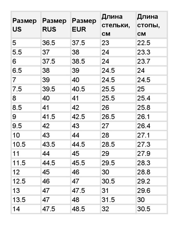 Размер US Размер RUS Размер EUR Длина стельки, см Длина стопы, см